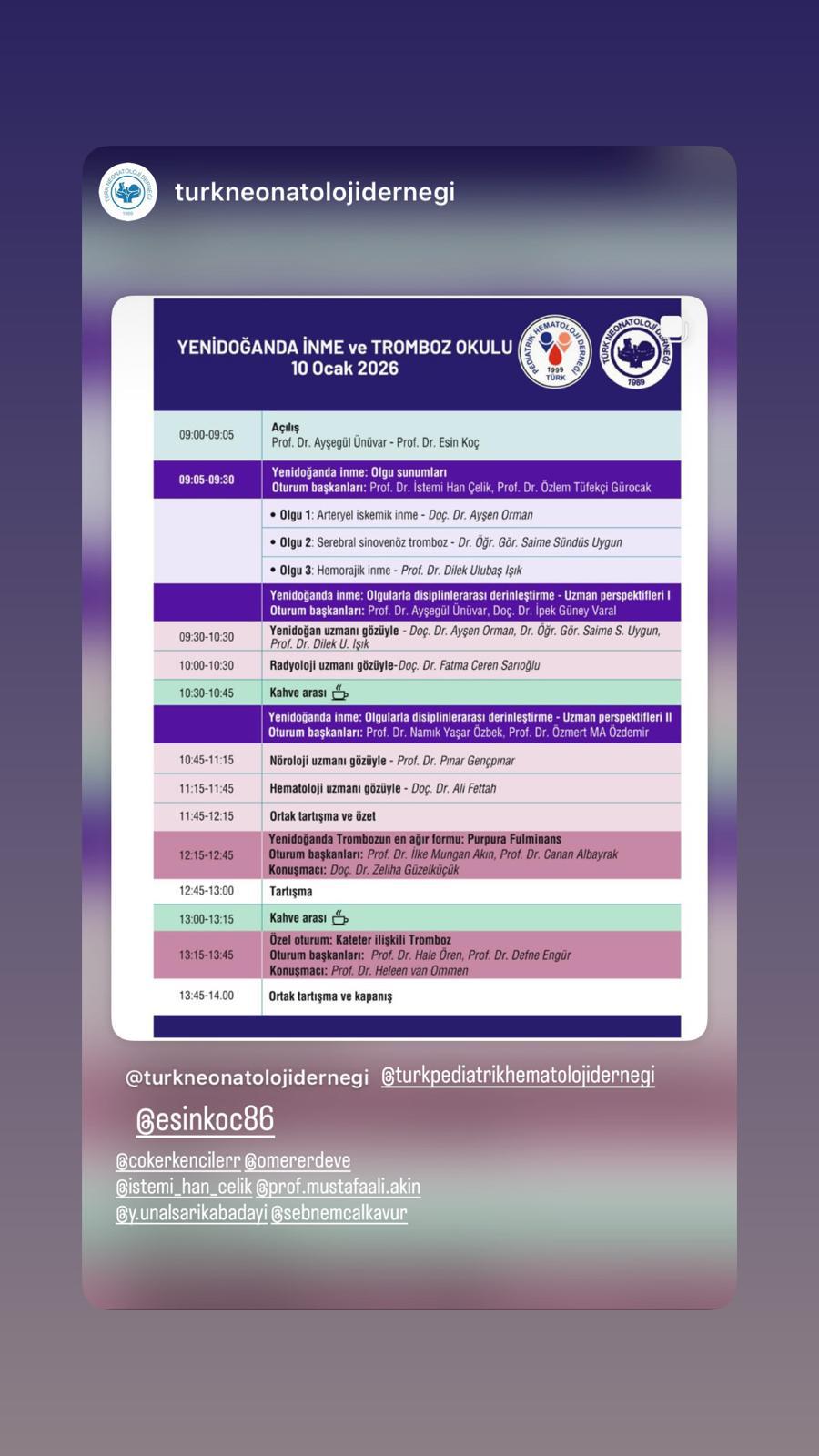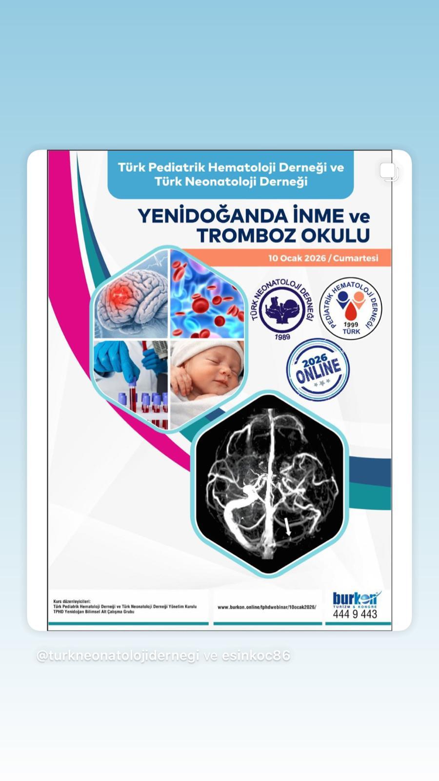 10 Ocak 2026 tarihinde gerçekleştirilen “Yenidoğanda İnme ve Tromboz Okulu” başlıklı çevrim içi bilimsel toplantı, Türk Neonatoloji Derneği ile Türk Pediatrik Hematoloji Derneği iş birliğinde başarıyla tamamlanmıştır.